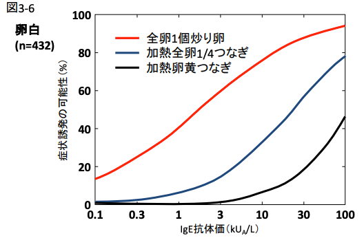 例えば、IgE抗体価が100kUA/Lの場合、「全卵1個炒り卵」では90%以上の患者さんでアレルギー症状が出現し、「加熱全卵1/4つなぎ」では80%程度、「加熱卵黄つなぎ」では半分以下の患者さんでアレルギー症状が出現するということが示されています。