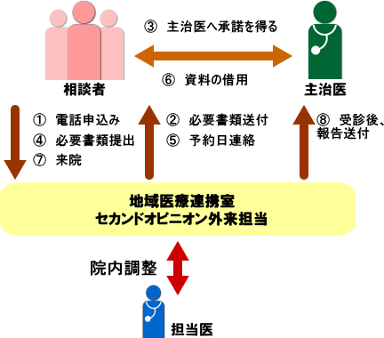 | 1 | 水戸済生会総合病院内の地域医療連携室セカンドオピニオン外来担当へお電話ください。受付担当がご相談の概要を伺います。 |