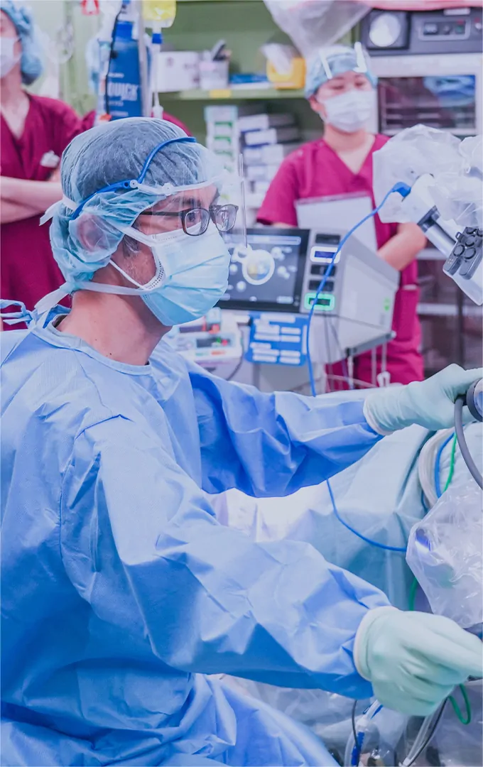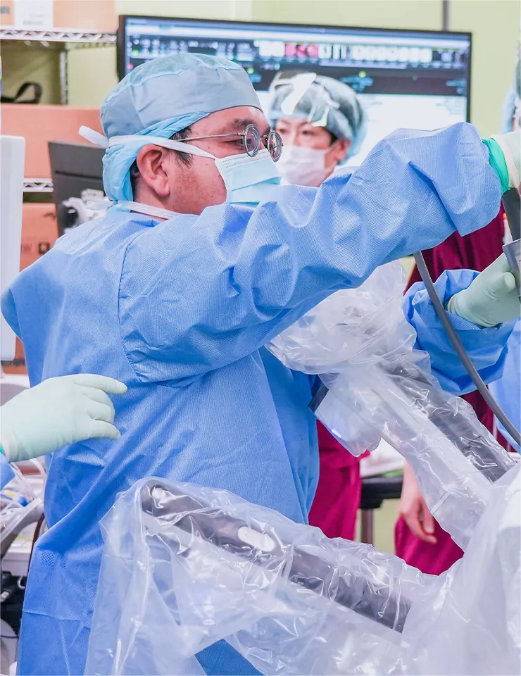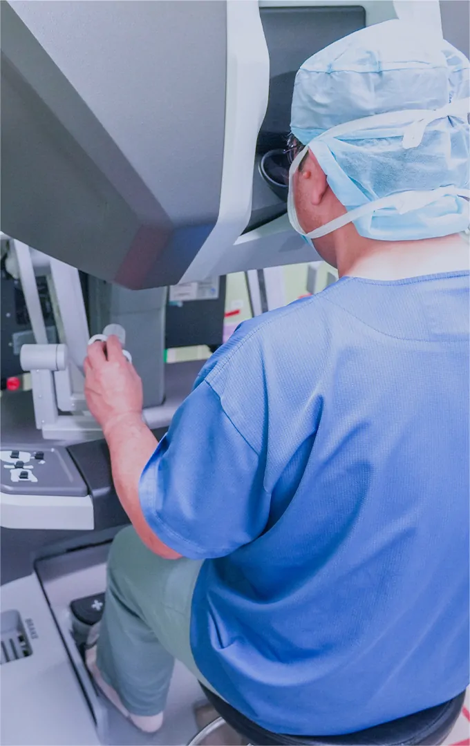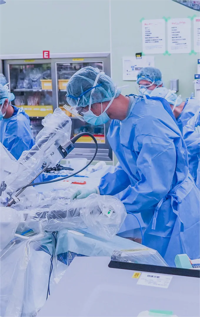 手術支援ロボットを使って、医師が手術を行う術式を「ロボット支援下内視鏡手術」といいます。ダビンチは、世界中の医療現場で最も普及している手術支援ロボットです。 内視鏡手術と同様に、患者さんの体に小さな穴を開けて手術を行います。