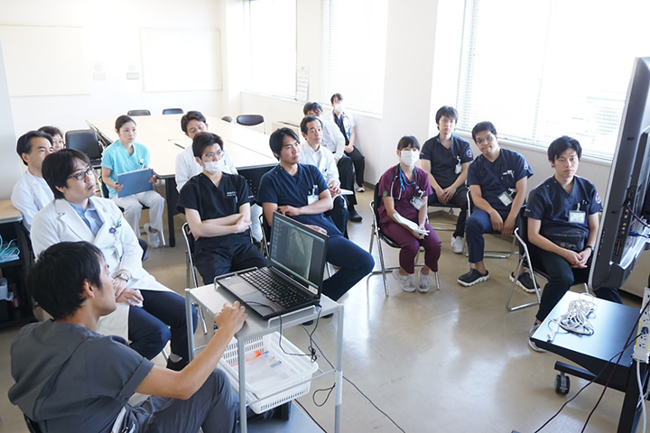 その象徴として、当循環器センターでは循環器内科、心臓血管外科が週に一度合同カンファレンスを行い、直近1週間のカテーテル治療、心臓血管外科手術を全例報告し検討しています。同時に、今後心臓血管の治療が必要となる患者さんにおいては、両科で最適な治療法について話し合い、患者さんにとって少しでも良い治療となるようハートチームとして検討しています。