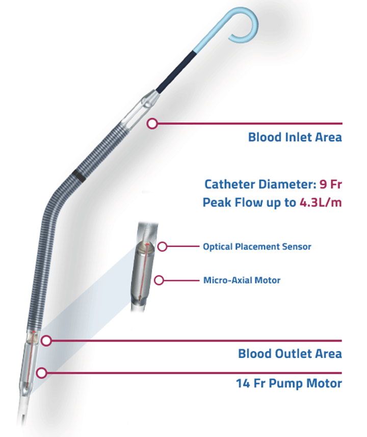 足の付け根から経皮的・経血管的にポンプカテーテルを挿入、ポンプ内の羽根車を高速回転して左室内のカテーテル先端の吸入部から血液をくみ出して、大動脈に位置した吐出部へ送り出すことで、順行性補助循環を可能にしています。