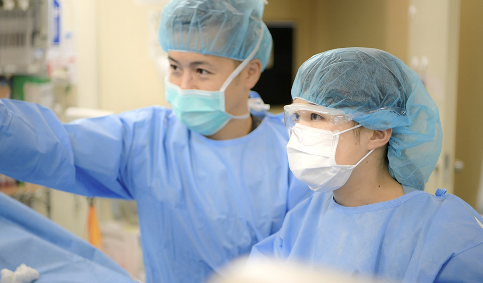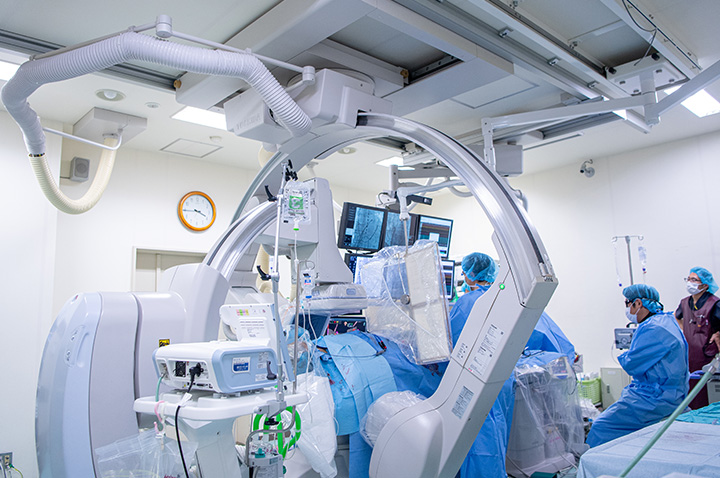 当院では、重症な病態により集中治療が必要な⼼疾患に関しては、24時間いつでも対応が可能な救急科との強い連携のもと、⼈⼯呼吸器、⼈⼯⼼肺装置などによる集中治療管理を⾏い、患者さんの救命や病状の改善にベストな体制を整え治療を⾏っています。