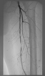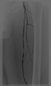 近年、糖尿病や維持透析患者さんの増加を背景として、閉塞性動脈硬化症という病気により下肢の壊疽から切断となる患者さんが増えています。当院では下肢動脈閉塞に対するカテーテル治療を長年に渡り行っています。また新しい治療機器も積極的に導入しています。末梢血管用ステントグラフト(血管内留置型人工血管)、薬剤塗布バルーン(再狭窄予防のために血管内に薬剤を塗布する専用バルーン)、薬剤溶出性ステント、その他の新規ステントなどが上げられます。またクロッサーと呼ばれる振動波により血管の中の石灰化を破砕する特殊治療など、患者さんの血管の状態に合わせて多くの新規の医療機器を用いて治療を行っております。さらに当院では腎臓の機能が悪く造影剤の使用が困難な方にもカテーテル治療が可能となるように、必要に応じ炭酸ガス造影を併用し、腎臓にかける負担を最小限にして検査・治療を行っています。