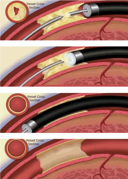 308nmのエキシマレーザー光をカテーテル先端から照射することで、血管内にできてしまった血栓やプラークを蒸散し、ガス、水分子などに分解することができると言われています。適応となる治療病変は幅広く、通常の新規病変、ステント内再狭窄病変、急性心筋梗塞における血栓性病変、石灰化病変、完全閉塞病変など多岐に渡る効果が報告されています。従来石灰化の強い病変にはロータブレーター(血管内高速回転アテレクトミー)という医療機器が有効とされていますが、このエキシマレーザーもバルーンによる拡張術など通常の治療方法では治療困難な硬い石灰化病変にも有効性が期待できます。また急性心筋梗塞などの血栓性病変、あるいはステント再閉塞といった比較的やわらかい病変に対しても、組織を蒸散させることができるエキシマレーザーは大きな効果を発揮します。