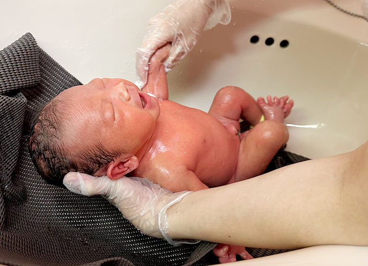 自宅に帰ってから、1カ月健診までは、あわ沐浴が出来ると思います。その後も、お風呂場で、同じようにできると思います。お風呂の洗い場にマット等を敷いて、あわで身体を洗い、シャワー等で石鹸を洗い流します。ママやパパと湯船につかり、お風呂からでたら、保湿をすると良いと思います。