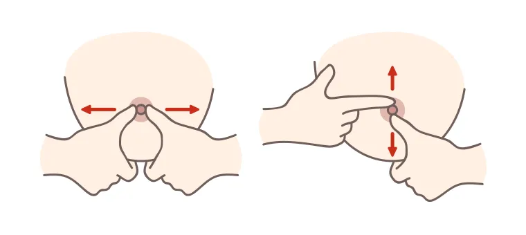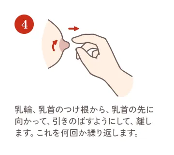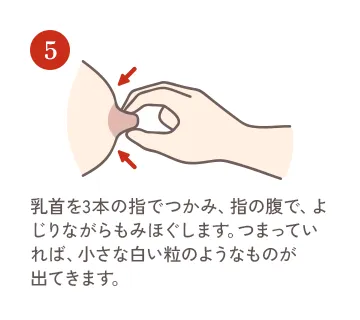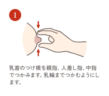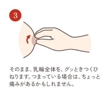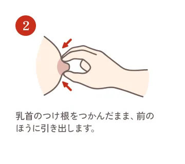 乳輪部(乳首のつけ根)に親指をおき、上下左右に引き伸ばします。