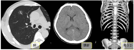 造影剤等薬剤を使用しないで撮影を行います。頭部や胸腹部を撮影することが多いです。また、骨折等の状態を確認するのにレントゲン写真で分かりにくい場合は、骨の3DCTを撮影することもあります(画像は左から 肺、頭部、骨3D)