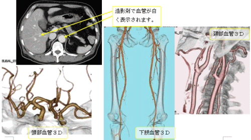 造影剤という薬を注射してから撮影を行います。撮影する部位や方法の違いで、何回か撮影することがあります。また、血管の3D撮影も行います。通常は、単純CTを撮影したあと造影剤を注射して造影CTを行いますが、造影CTのみの場合もあります。
